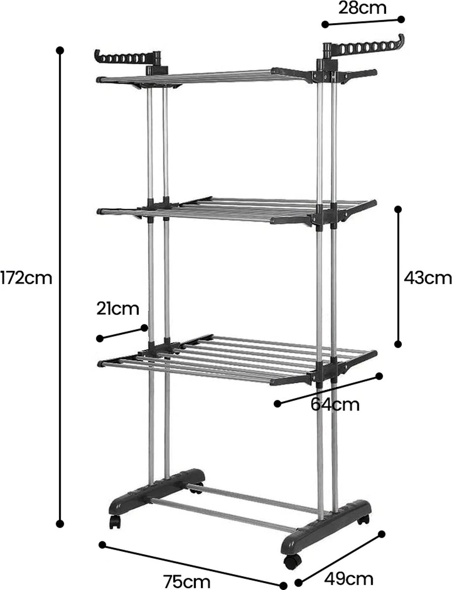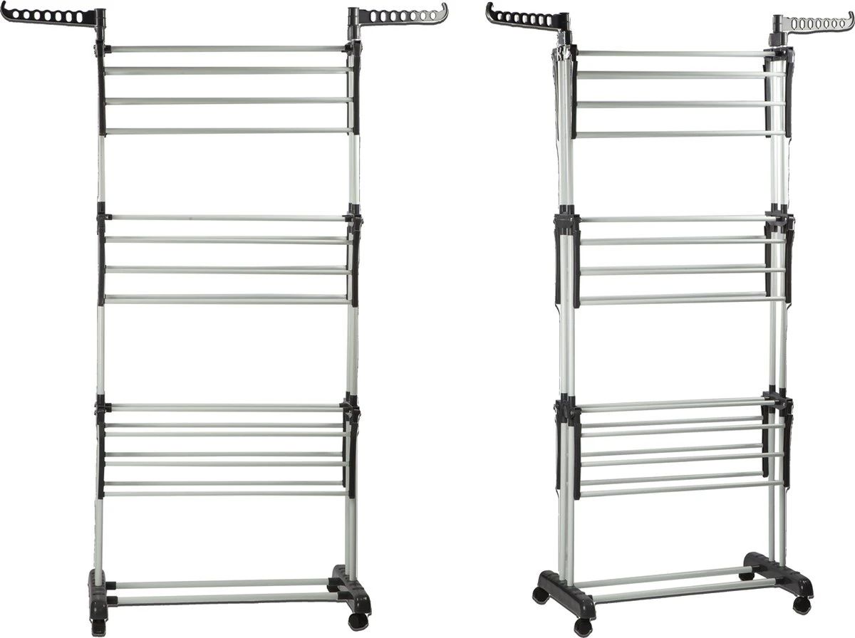 Gepoedercoat tegen roest en corrosie, kan dit bewegende rek uw kleding opslaan en ordenen. Dit wasrek bestaat uit 6 inklapbare legborden en maakt het gemakkelijk om veel wasgoed op te hangen. De basis wordt ondersteund door 2 gepoedercoate stalen basisstaven voor een betere ondersteuning. Het is gemakkelijk te monteren, door de makkelijk te volgen handleiding. Dit bewegende kledingrek is veelzijdig en kan worden gebruikt als droogstation of als kledingkast!