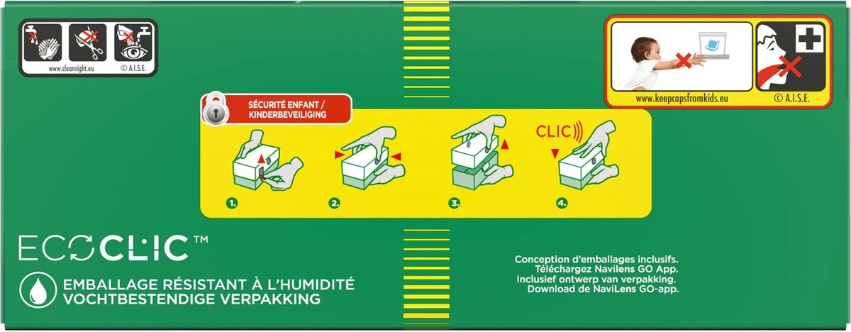 - Ecoclic kartonnen doos: Zorg voor minder plastic met Ariel All in 1 Wasmiddel Pods, nu in een recyclebare kartonnen doos die gemaakt is met 70% gerecyclede vezels en maximaal 5% plastic