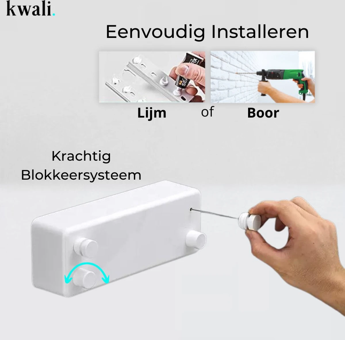 Ben je het zat dat je waslijn in de weg hangt? De gemakkelijke en milieuvriendelijke uittrekbare waslijn van kwali. heeft twee waslijndraden met stalen kern die jaren mee zullen gaan.