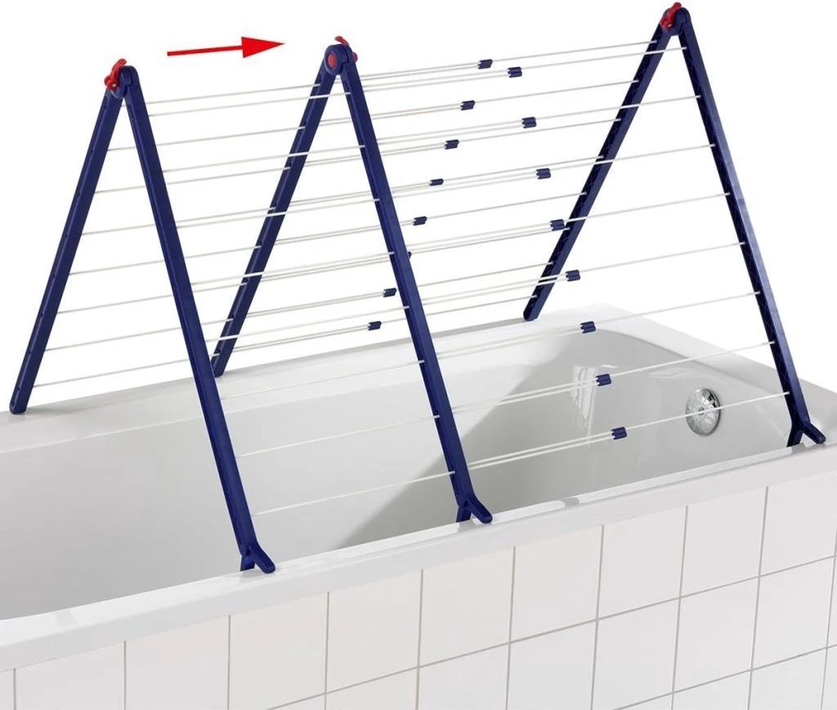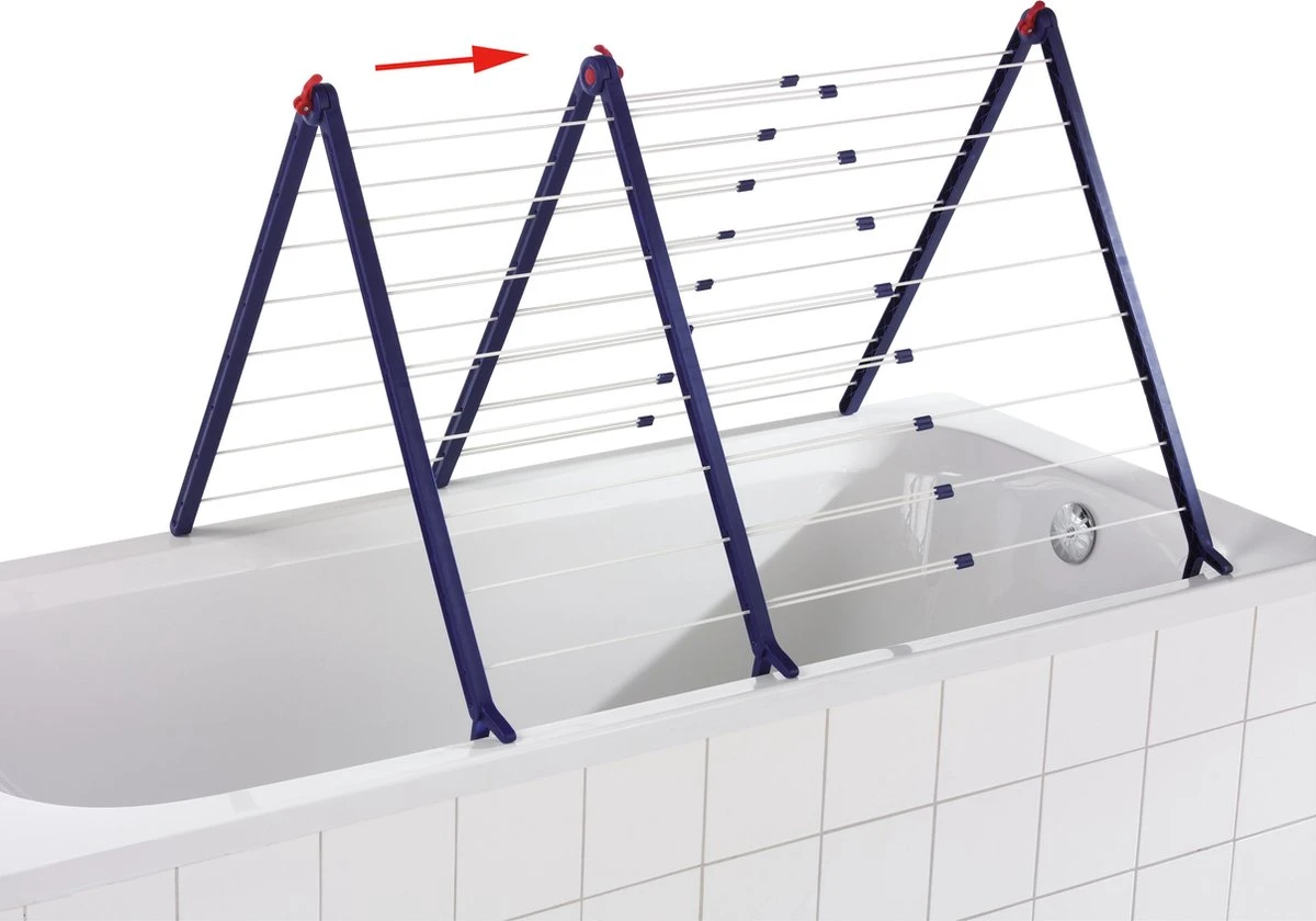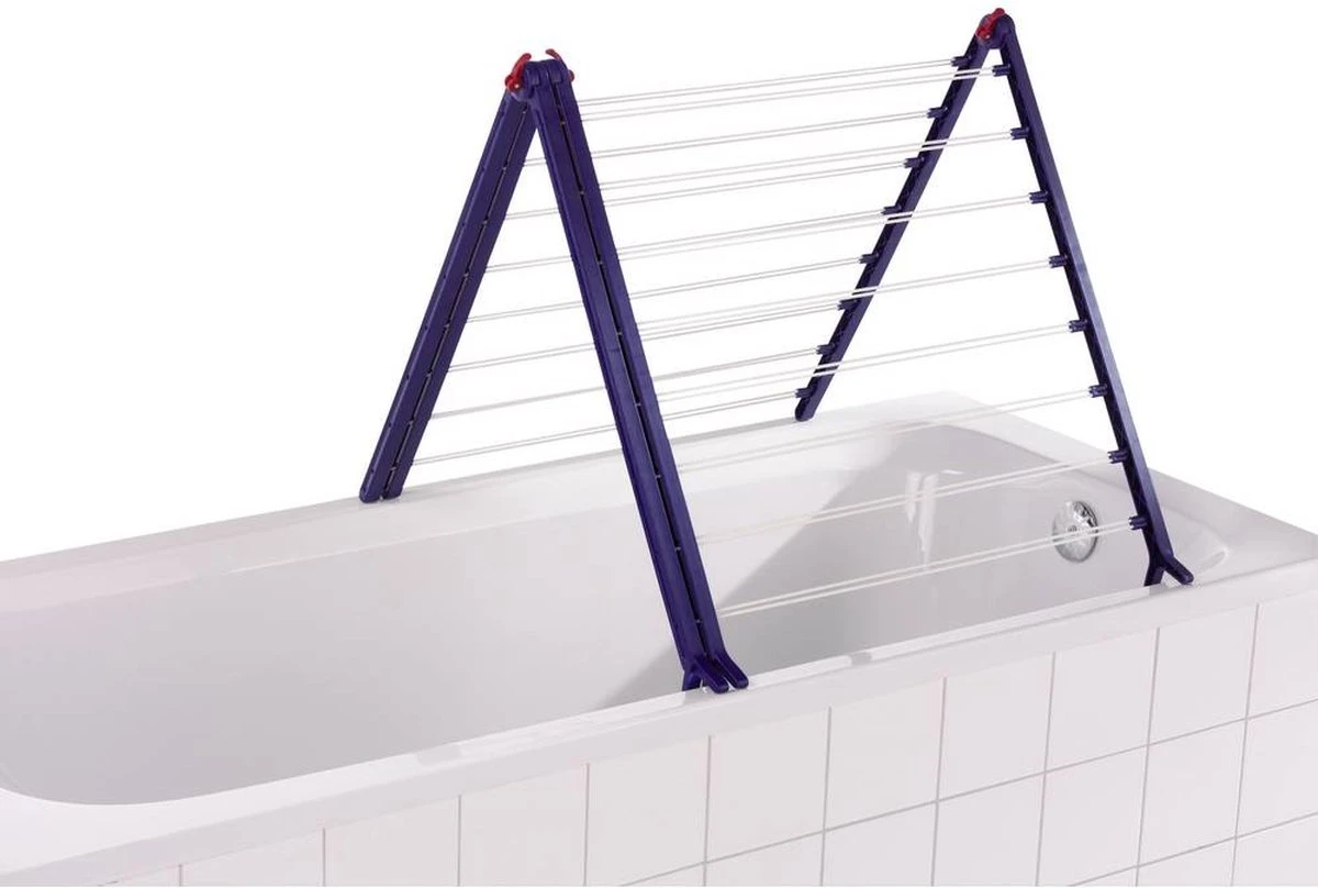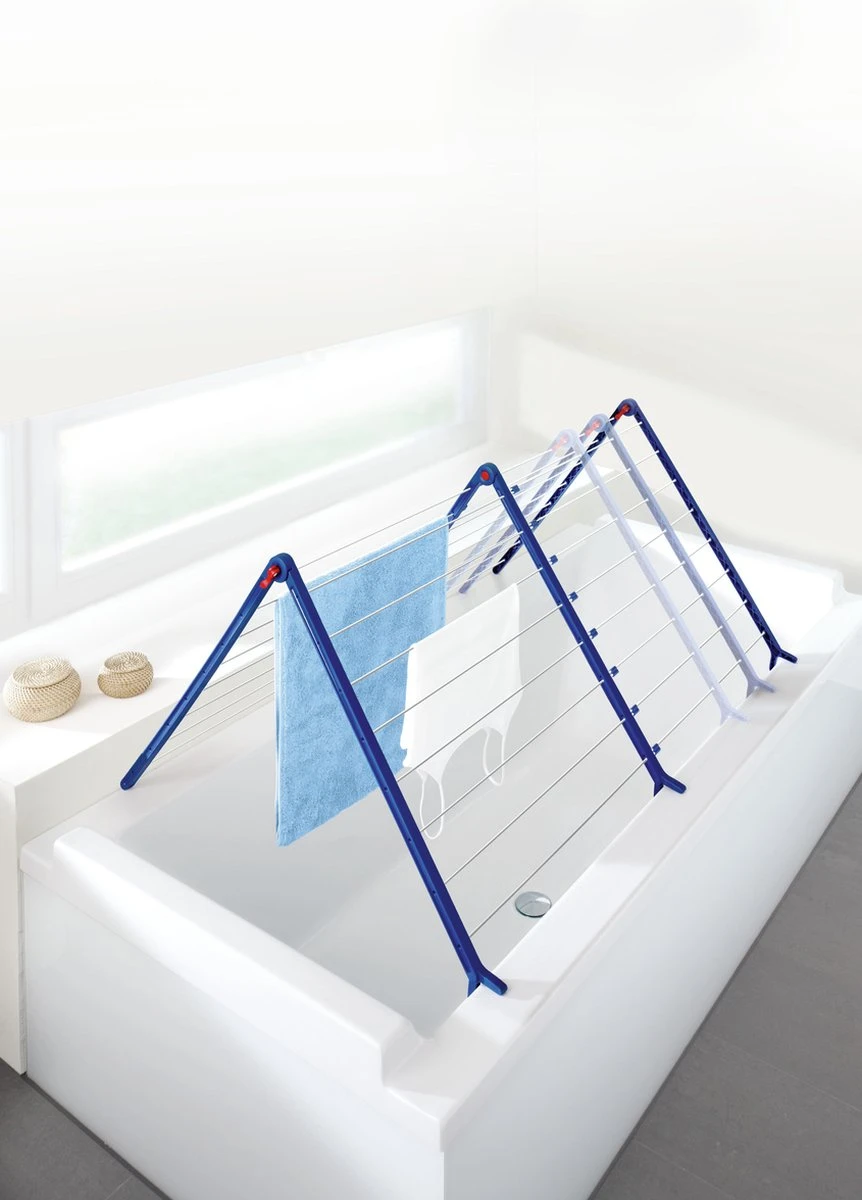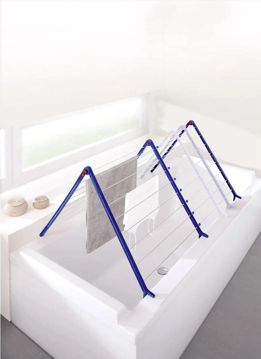 Handiger kan haast niet: in de A-stand kan het droogrek Pegasus Bath 190 Extendable snel en eenvoudig op ieder gangbaar ligbad geplaatst worden. Droogrekken hoeven dus geen sta-in-de-weg meer te zijn. Geen plassen meer op de vloer wanneer je druipnat wasgoed ophangt. Afhankelijk van de hoeveelheid wasgoed kun je de breedte van het droogrek Pegasus Bath 190 Extendable aanpassen. De drooglengte varieert van 9,6 tot maximaal 18,9 meter in volledig uitgeschoven positie. Dankzij de drievoudige vergrendeling blijft het droogrek in elke positie stabiel staan. Droogrek Pegasus Bath 190 Extendable is simpel op te zetten, geen montage nodig. De beide klapbare delen kunnen in 16 posities vastgezet worden en passen met de stabiele pootjes op de rand van ieder bad. Het droogrek kan moeiteloos opgezet en net zo gemakkelijk weer ingeklapt worden. Compact inklapbaar voor plaatsbesparend opbergen. Een speciale coating beschermt de stabiele droogstangen van de Pegasus Bath 190 Extendable tegen roest. Van dit droogrek zul je jarenlang plezier hebben