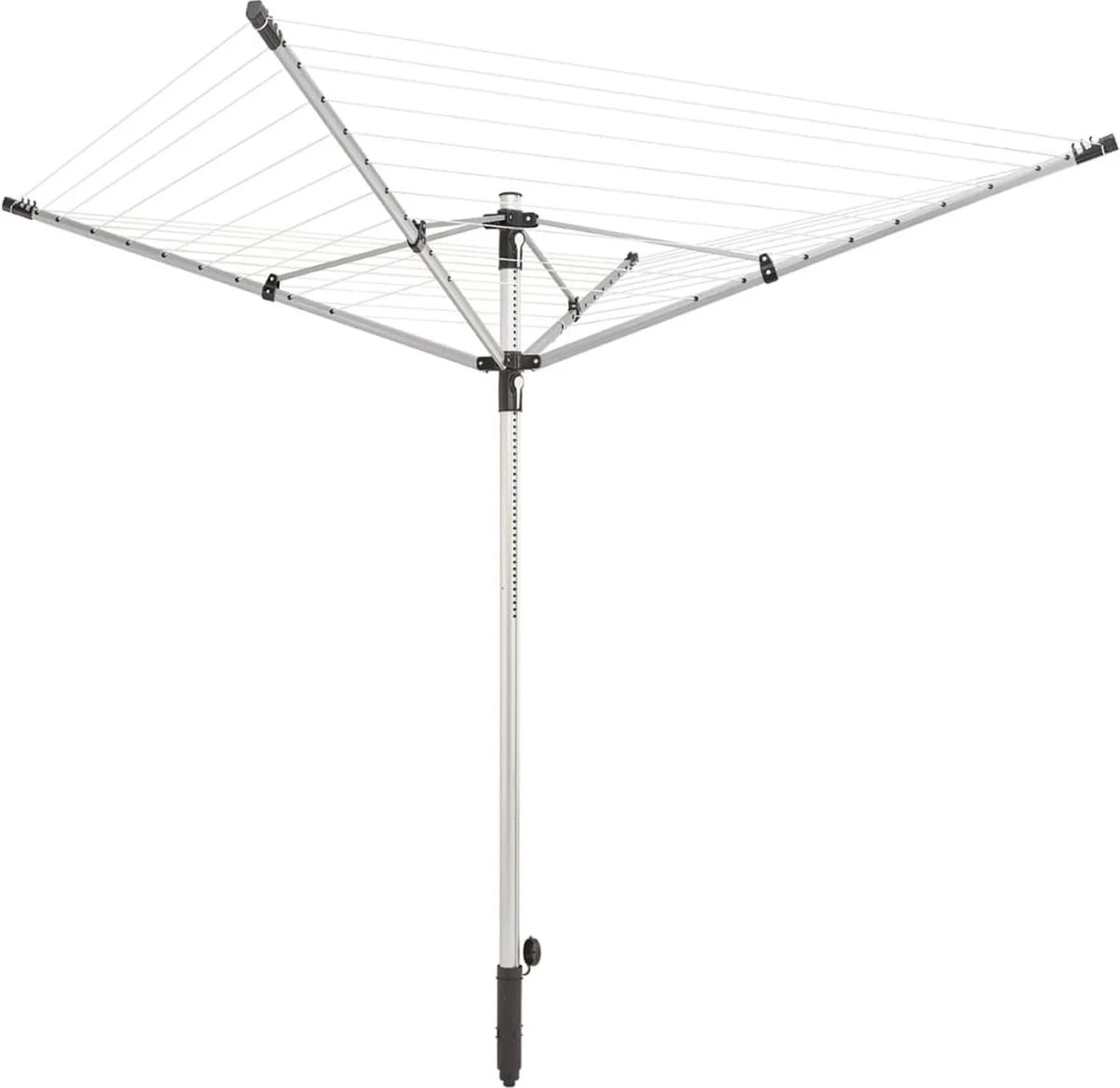 50 Meter drooglengte, opent in een flits en altijd de juiste hoogte: de LinoPush 500 droogmolen van Leifheit is het meest betaalbare en eenvoudig te gebruiken basismodel voor het drogen van was in de tuin, vooral waar de ruimte beperkt is. De waslijnen kunnen maximaal 5 wasmachineladingen bevatten. Dankzij het geavanceerde openingssysteem kunnen de armen van de droger gemakkelijk en snel worden geopend – zonder dat de lijnen verward raken. De lijnen worden gespannen bij het openen van de droger en worden automatisch op hun plaats vergrendeld. De droogmolen in hoogte verstelbaar tussen 135 cm en 180 cm, zodat elke gebruiker de juiste werkhoogte kan vinden. In totaal zijn er 12 haken voor kleerhangers verdeeld over de vier roterende armen, die extra ruimte bieden voor het snel en kreukvrij drogen van blouses, overhemden en T-shirts. De stalen draagarmen en een stevige centrale paal zorgen ervoor dat de droogmolen stevig is – zelfs wanneer deze helemaal vol hangt met wasgoed. Inclusief beschermhoes en bodemhuls voor het betonneren.
