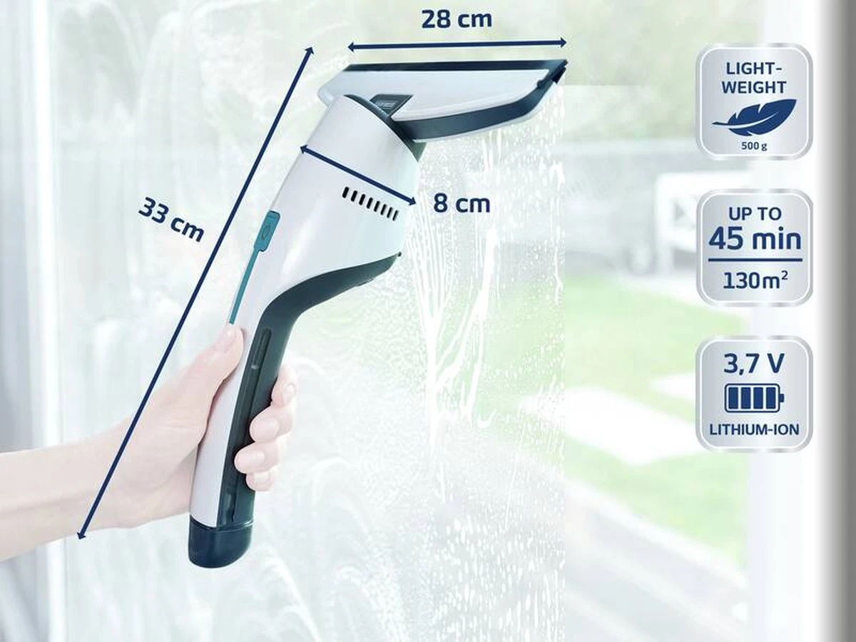 Met de automatische zuigfunctie zuigt het ruitenreinigingsapparaat gladde oppervlakken supersnel stralend schoon – zonder strepen, zonder gedruppel. De smalle vorm werkt heel prettig en gemakkelijk. Het reservoir is plaatsbesparend geïntegreerd in de handgreep, waardoor je het raam in één keer van boven naar beneden kunt zuigen, zonder dat de vensterbank in de weg zit. De raamzuiger komt tot helemaal onderaan, dus je hoeft geen water meer op te vegen. Ook in de badkamer ontpopt zich deze handige raam- en badkamerzuiger als een echt multitalent: spiegels, tegels en de douchecabine maak je moeiteloos streeploos schoon.