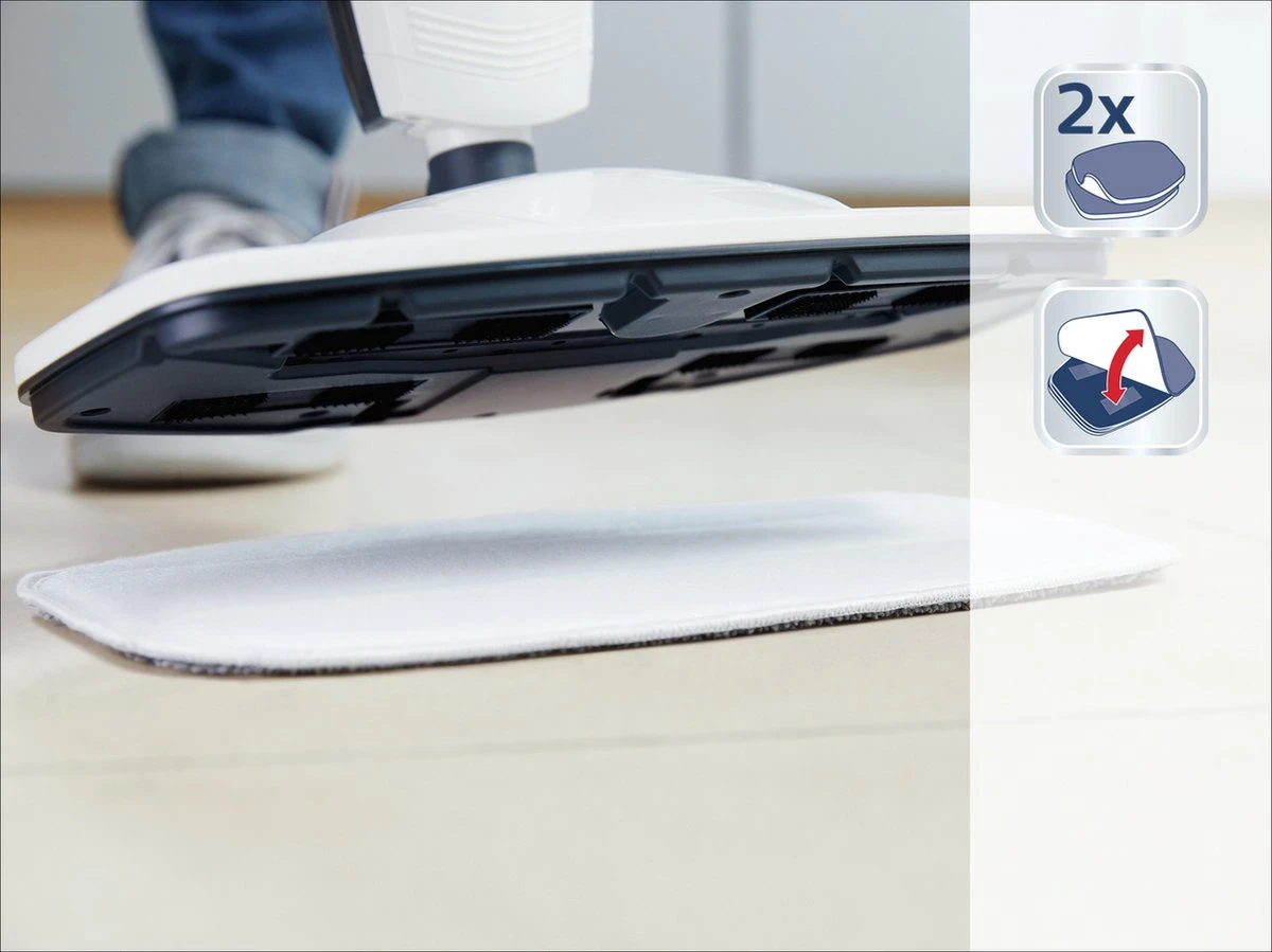 Twee hoogwaardige microvezel pads voor hygiënische vloerreiniging met de Leifheit stoomreiniger CleanTenso. De hete waterdamp van de stoomreiniger maakt vuil, bacteriën en ziektekiemen los. De pads nemen dat grondig op. Zo ondersteunen ze perfect de poriëndiep reinigende werking van de CleanTenso. Dankzij de als klittenband werkende textuur zijn de pads heel eenvoudig te bevestigen en te verwijderen. Wasbaar op 60°C.
