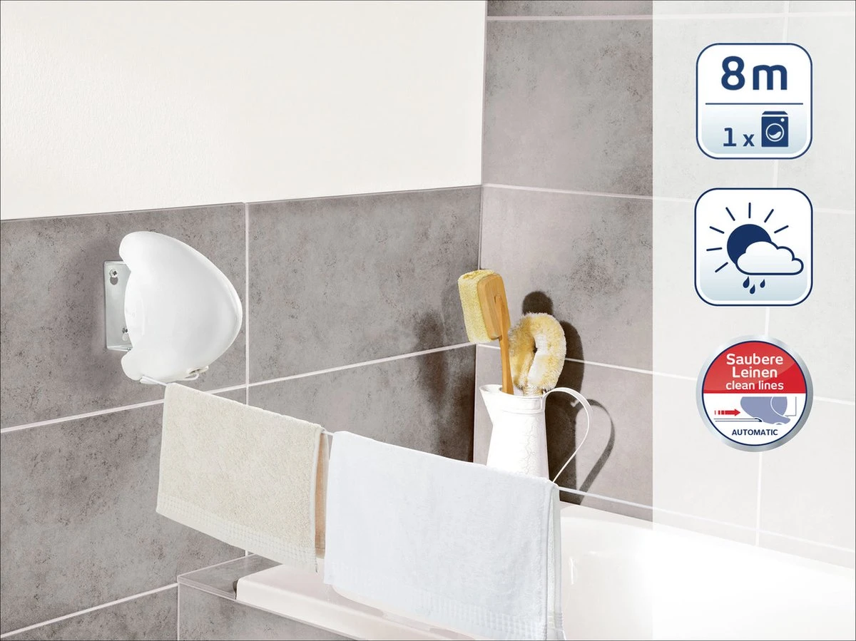 Zo gemakkelijk kan drogen zijn. De vlakke drooglijnautomaat Rollfix 80 Single Longline van Leifheit aan de wand of aan een paal bevestigen. De lijn uittrekken, vasthangen en klaar! Buiten, op het balkon, in de tuin, maar ook in de badkamer, kelder of in de keuken: deze strakgespannen waslijn is overal te gebruiken. Handig als je geen plek hebt waar permanent een droogrek kan staan. Doordat de waslijn automatisch naar binnen getrokken wordt, blijft de lijn altijd schoon … en de was dus ook.