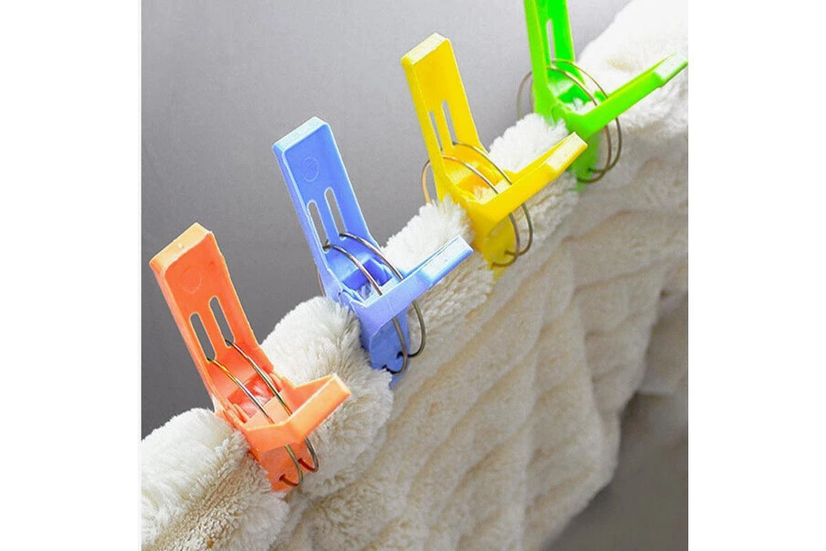 Grote plastic knijpers set om uw strandlaken, kleedje of kleding vast te klemmen aan uw strandstoel of ligbed. Onmisbaar op vakantie. U kunt de knijpers op iedere hoek van de stoel of het ligbed vastklemmen. Een zakje bevat 4 knijpers. U ontvangt 2 zakjes. Materiaal: plastic. Lengte: 12 cm.