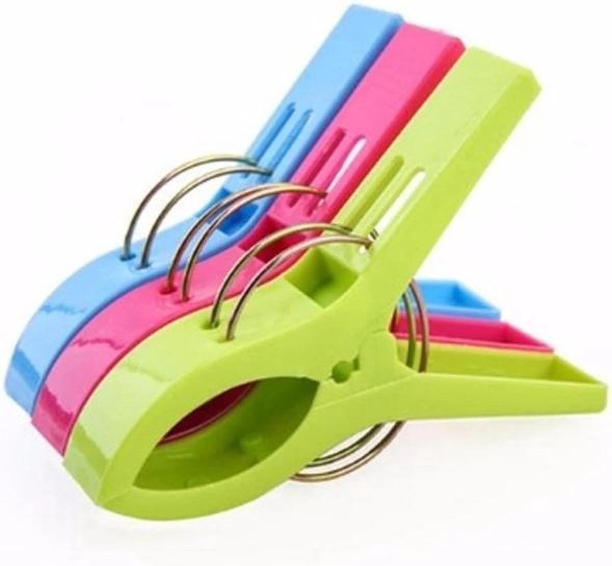 Grote plastic badlaken knijpers 4 stuks 12 cm. Grote plastic knijpers set om uw strandlaken, kleedje of kleding vast te klemmen aan uw strandstoel of ligbed. Onmisbaar op vakantie. U ontvangt vier plastic knijpers welke u op iedere hoek van de stoel of het ligbed kunt vastklemmen. Materiaal: plastic. Lengte: ongeveer 12 cm. Breedte: ongeveer 2 cm. Diepte: ongeveer 8 cm.