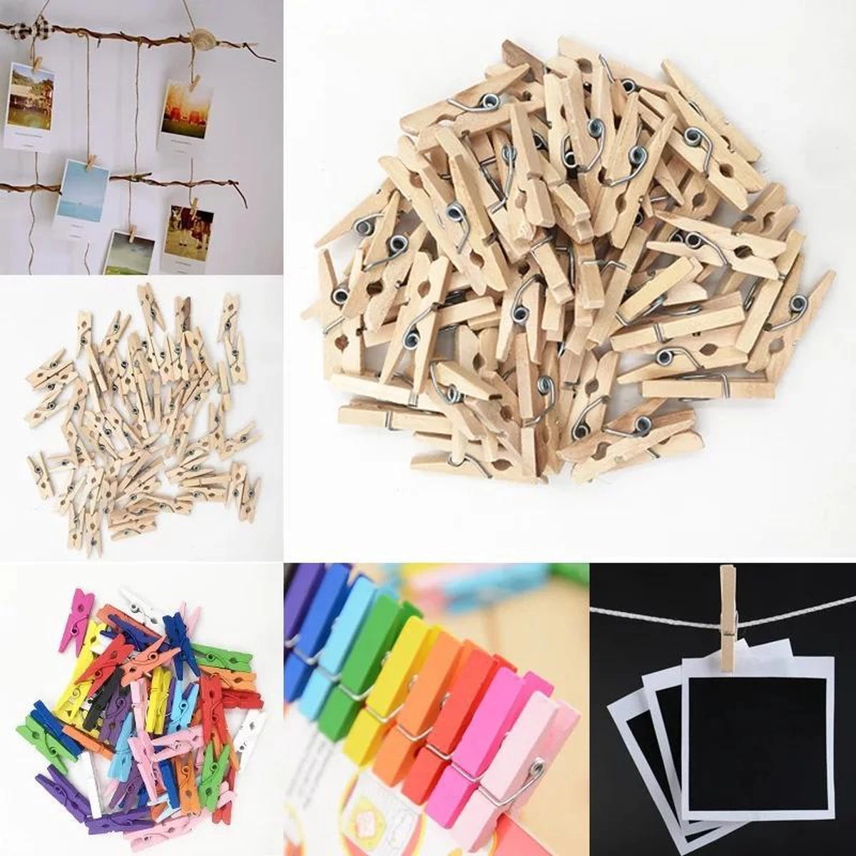 200 houten mini-wasknijpers. Gebruik ze om kaartjes of tekeningen op te hangen of om leuke kunstwerkjes of knutselwerkjes mee te maken. De knijpers zijn 2,5 cm groot.