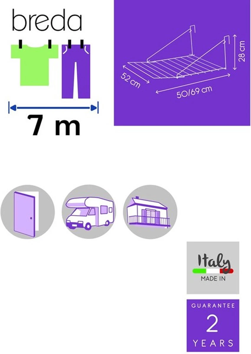 Het ophangen van kleding wordt erg makkelijk met het Metaltex Breda hangdroogrek, met 7 meter drooglengte verdeeld over 11 drooglijnen. Dit droogrek hang je aan een radiator, aan een deur of aan een balkon. Het is ook zeer handig voor de caravan of camping. De haken passen op een maximale breedte van 5cm.