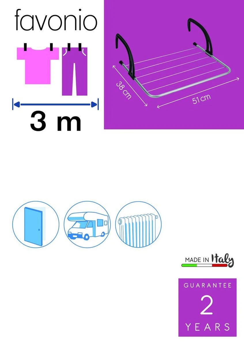 De Favonio past op verscheidene structuren, zoals op een balkon, op een radiator of op een deur door de verstelbare en inklapbare armen. Het hangdroogrek Favonio is ook handig voor camping en caravan. Met zijn inklapbare armen neemt het nauwelijks opbergruimte in. Er worden ook twee kunststof doppen meegeleverd die de structuur beschermen waarop het droogrek wordt gefixeerd.