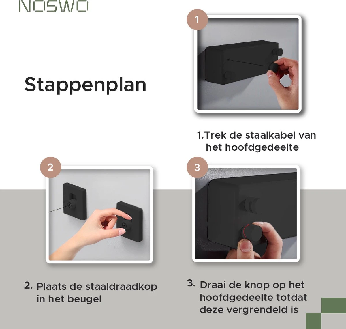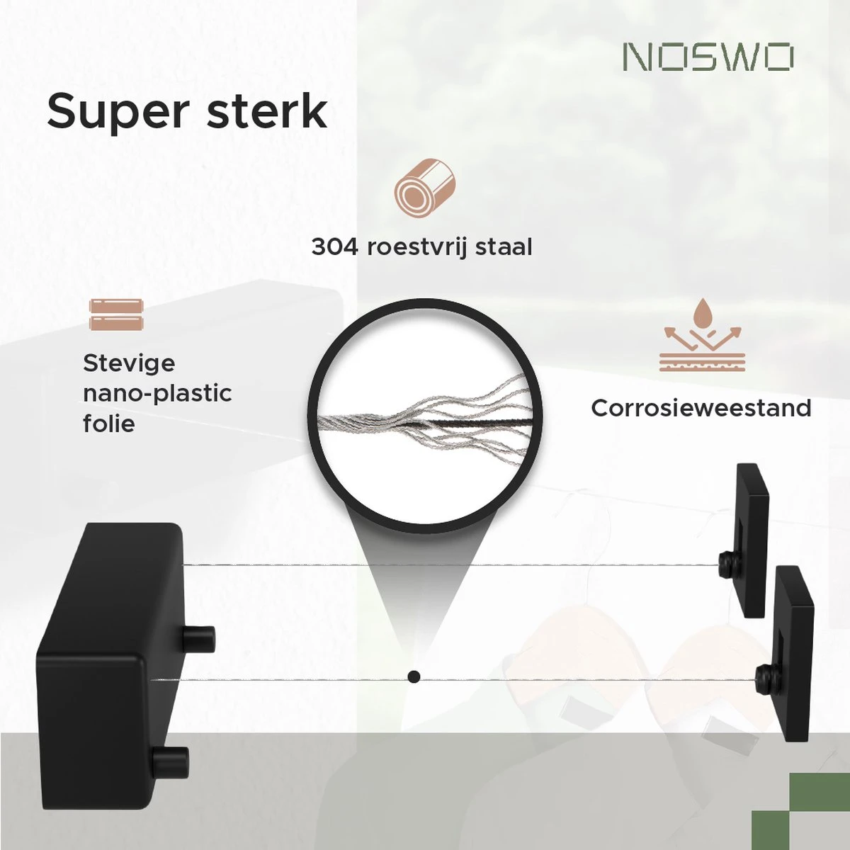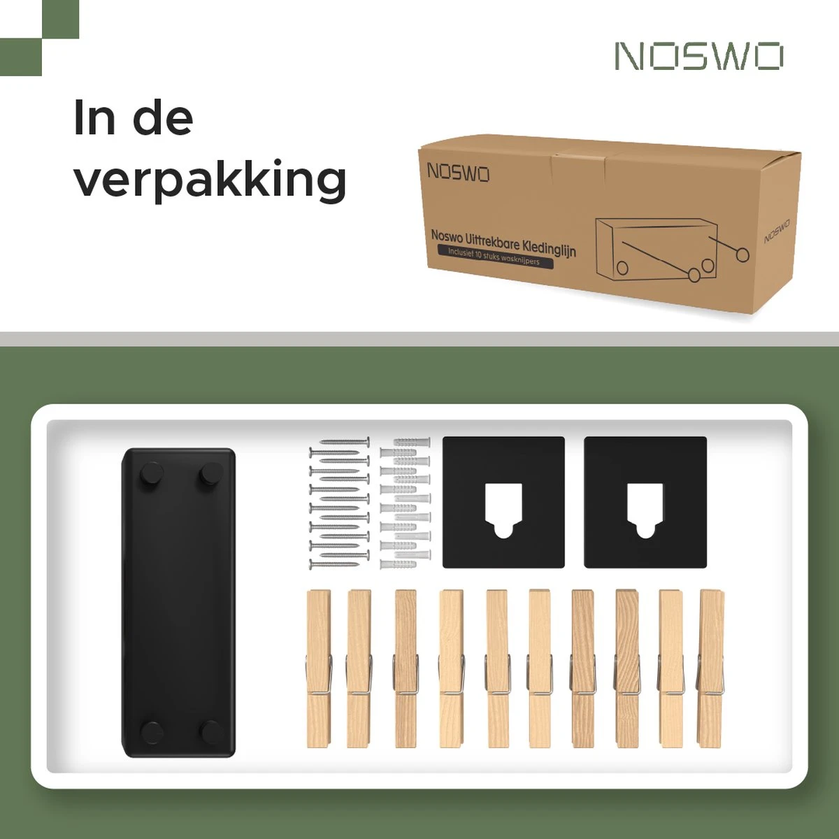Ben je de beperkte ruimte voor het drogen van jouw kleding in je huis zat? Dan is de Noswo uitrekbare waslijn de oplossing! Met twee lijnen van elk 4,2 meter lang, verstelbare lijnspanning, gebruiksvriendelijk en de optie om met of zonder boor te installeren, is het een echte upgrade. Het biedt genoeg plek om al jouw wasgoed op te hangen (8.4m drooglengte), zowel voor binnen als buiten. Daarnaast bespaar jij ruimte en ben je ook nog is milieuvriendelijk bezig. En als bonus wordt het geleverd met 10 extra houten wasknijpers om je kleding gemakkelijk op te hangen.