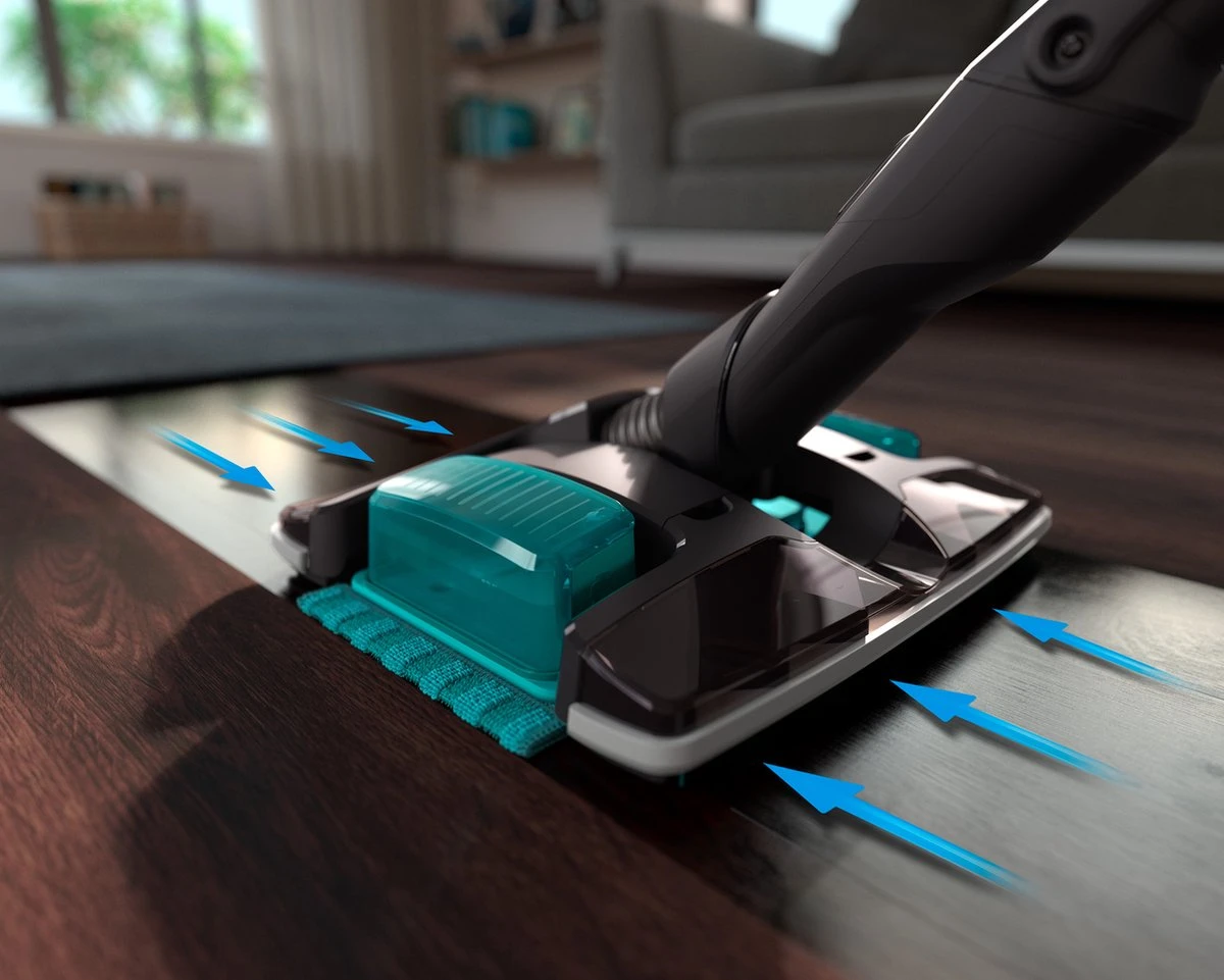 - Het mondstuk buigt om de zuigkracht slim af te stellen op de plek waar die nodig is met behulp van de dubbele zuigkanalen: één aan de voorzijde en één aan de achterzijde. Beide zuigkanalen hebben een zigzagontwerp en een unieke, gepatenteerde waterdistributie. Waarmee stof nog beter wordt weggezogen.