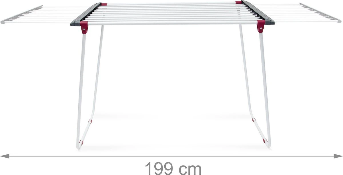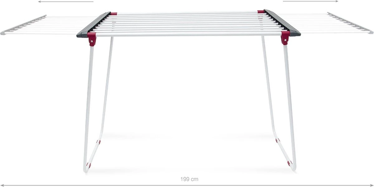 Het uitschuifbare droogrek is zeer stabiel. Hij is tot 25 kg belastbaar en kan op de dikke metalen stangen ook zwaar wasgoed dragen. Het wasrek is uitgerust met uitschuifbare zijkanten, die je naar wens uit of in kunt schuiven. De 9 stangen van het middelste deel zijn 100 cm lang en 1 cm dik. De stangen aan de zijkanten zijn half zo dik en ca. 42 cm lang. Daardoor ontstaat een totale drooglengte van 18,2 m waarop je je wasgoed kunt drogen. Voordeel van de dikke stangen: lelijke vouwen van het ophangen, zoals bijvoorbeeld aan de waslijn, zijn verleden tijd.