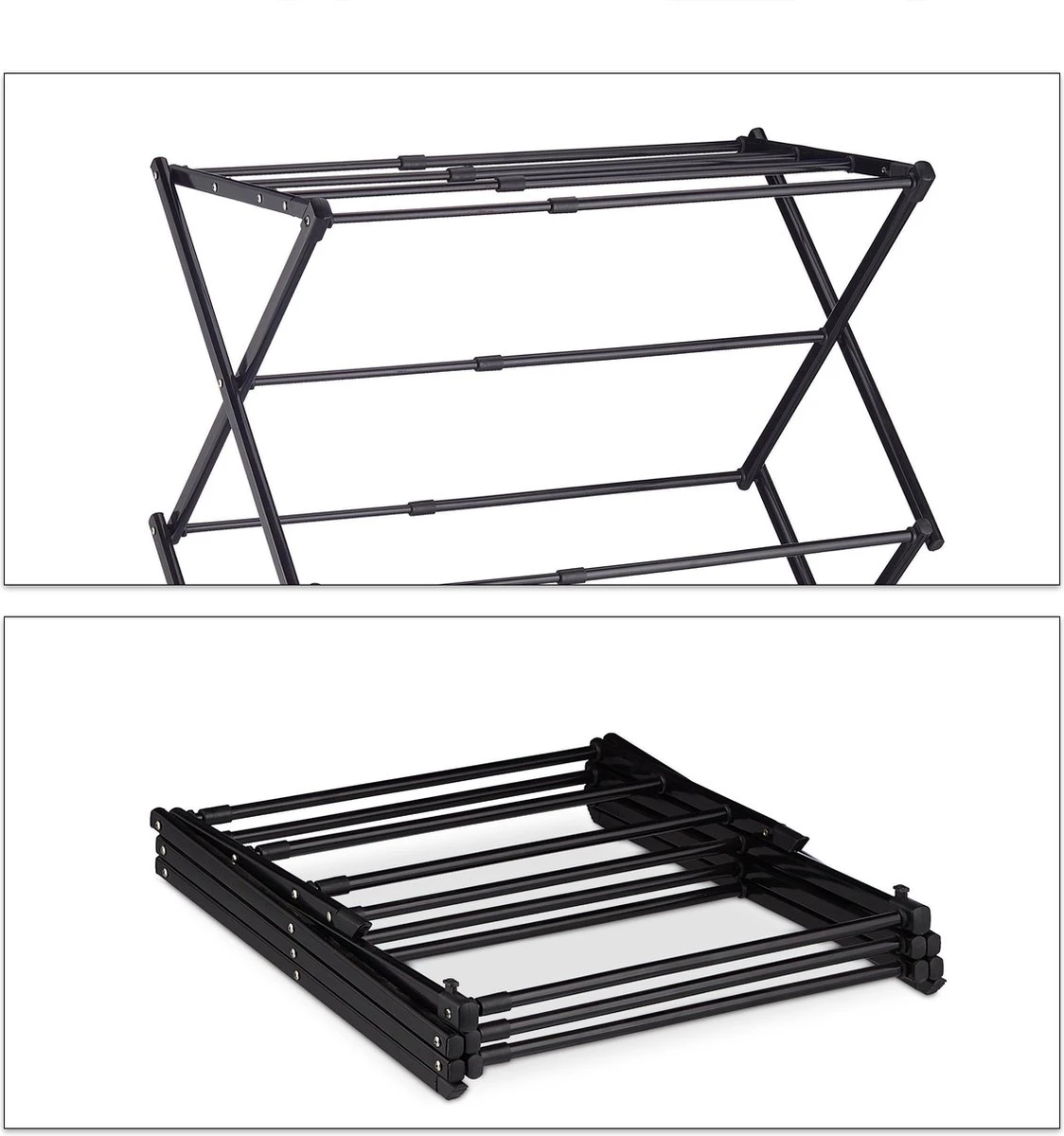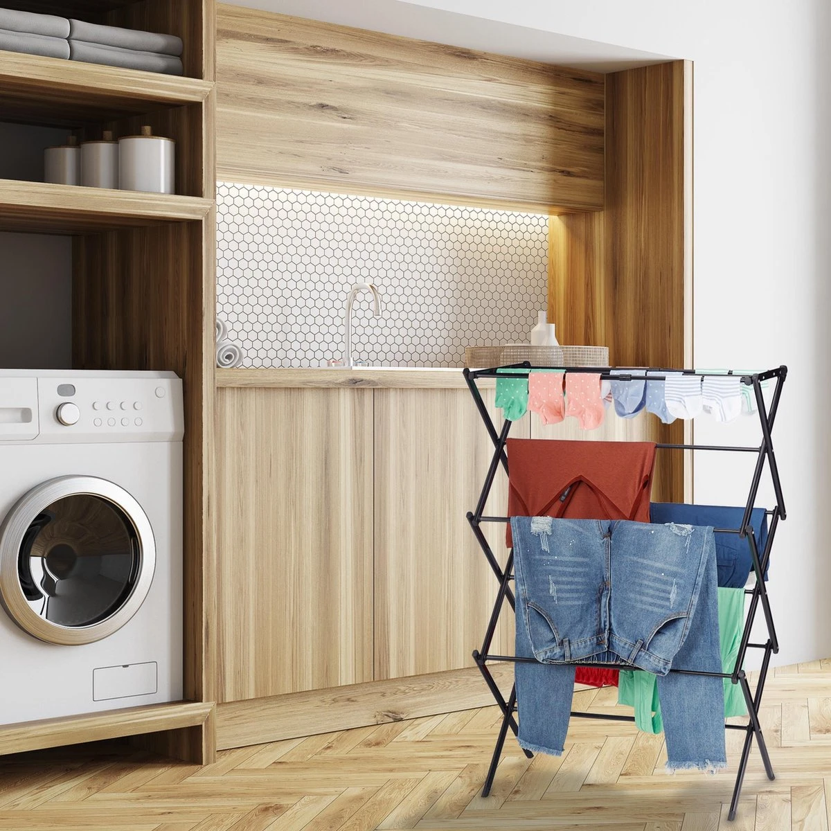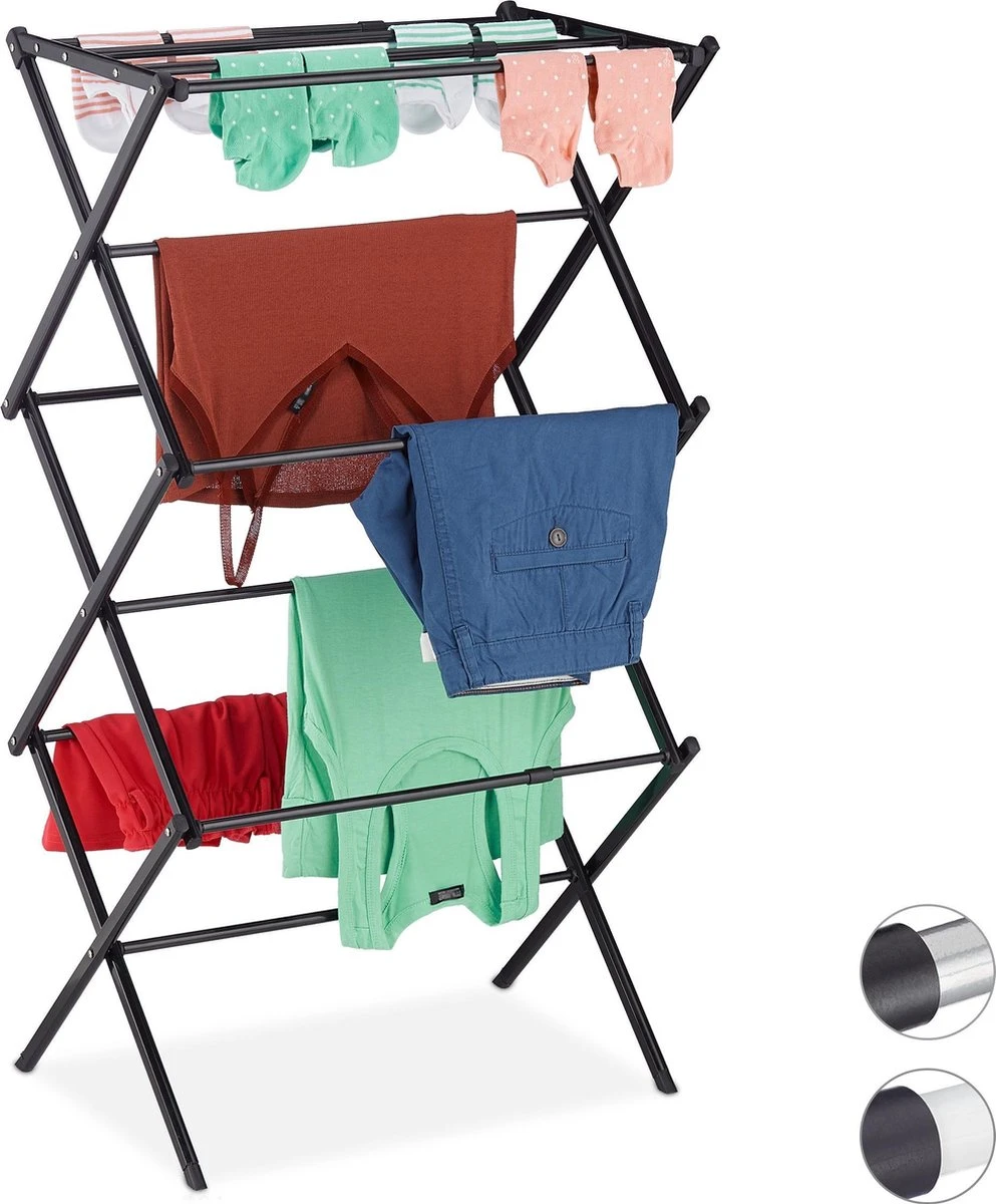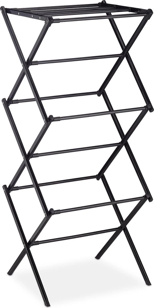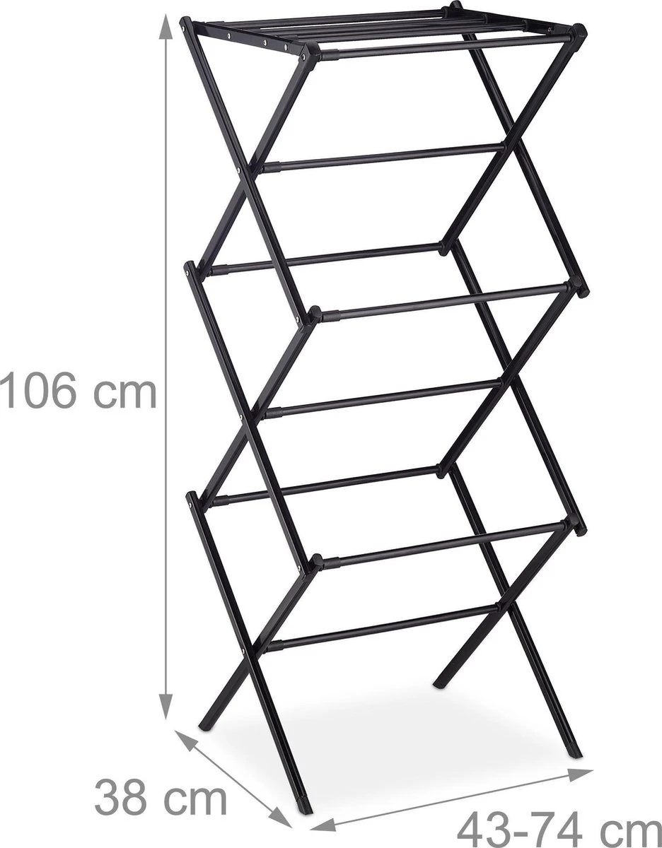 Wanneer je de was na het wassen wilt drogen, neemt dat vaak veel ruimte in beslag. Dit opvouwbare wasrek is een ruimtebesparende oplossing. Op 6 etages met in totaal 11 stangen kan je bovenbekleding, broeken of ondergoed ophangen. Is de waslading toch iets meer als gedacht, dan kan de kleine droogmolen uitgeschoven worden. Bij niet gebruik kan het inklapbare wasrek vlak ingeklapt en bijvoorbeeld onder het bed opgeborgen worden.