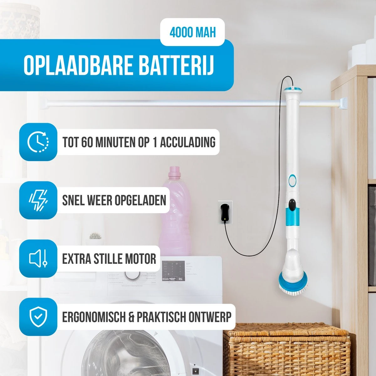 Erg fijn aan de elektrische schoonmaakborstel, is dat hij draadloos is. Hierdoor neem je de roterende schrobmachine eenvoudig overal mee naartoe. De 4000mAh schoonmaakborstel is binnen 3 uur volledig opgeladen, waarna deze tot wel 60 minuten meegaat.