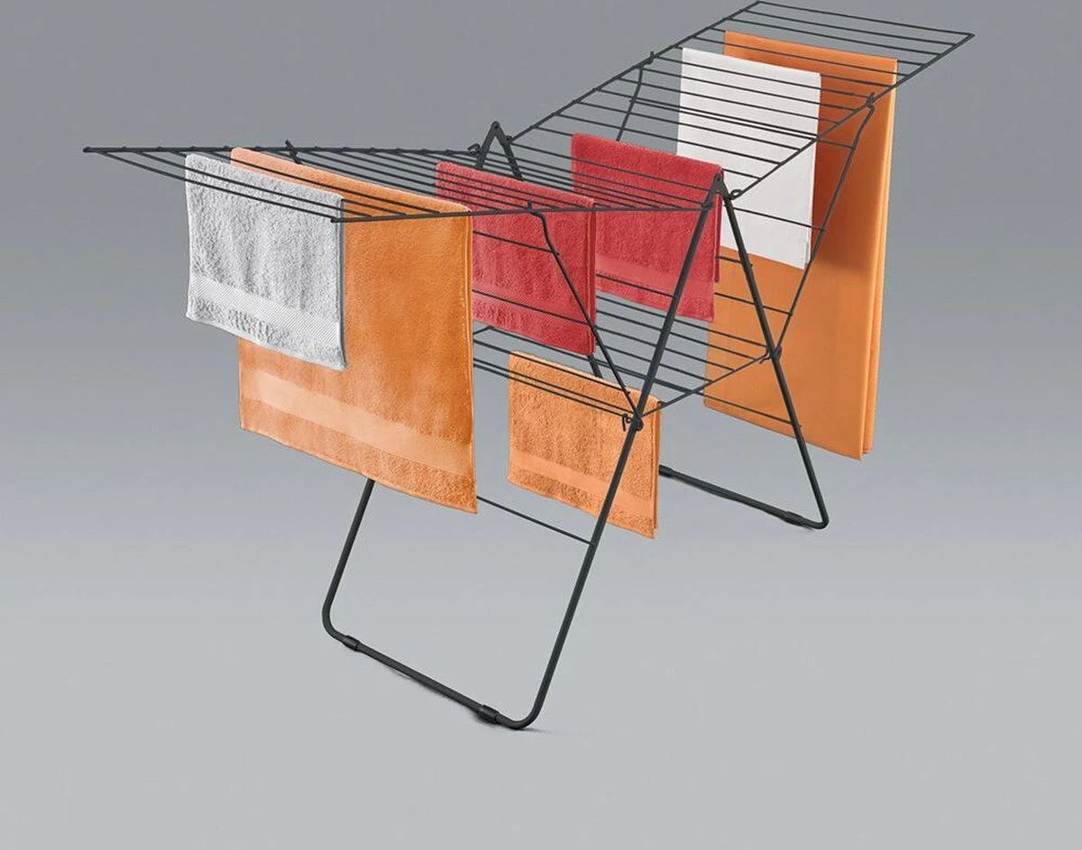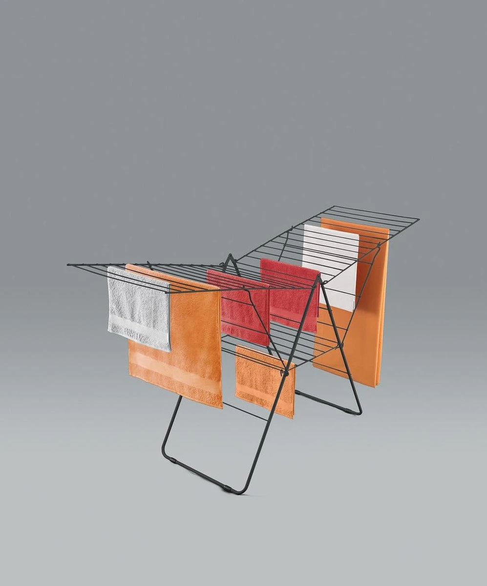 Je kunt de vleugels van het Amsterdam droogrek op verschillende hoogten instellen, waardoor het rek geschikt is voor het drogen van korte en lange kleding, handdoeken en lakens. De vleugelvorm geeft het Amsterdam droogrek een grote stabiliteit.