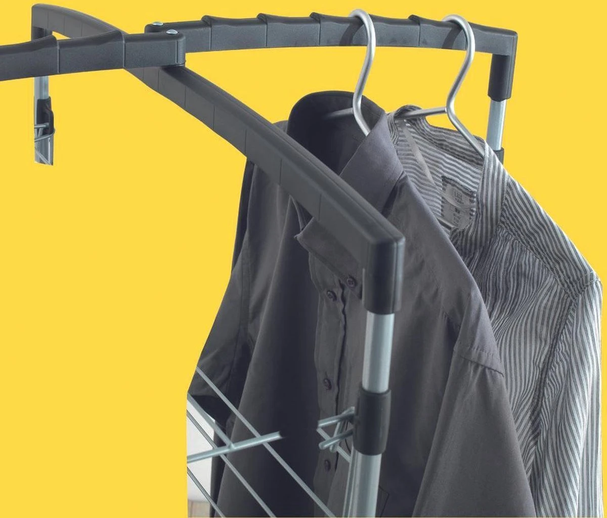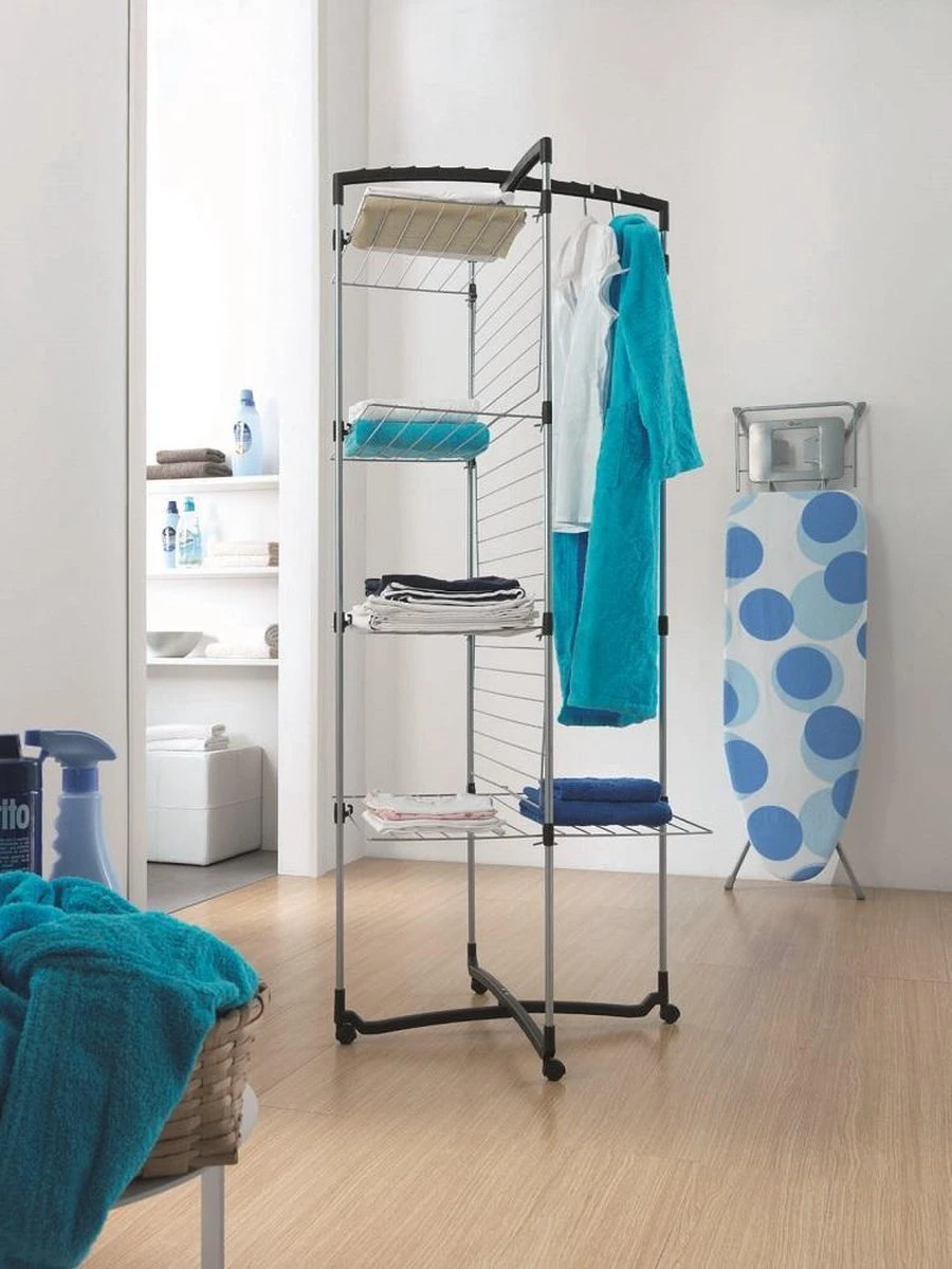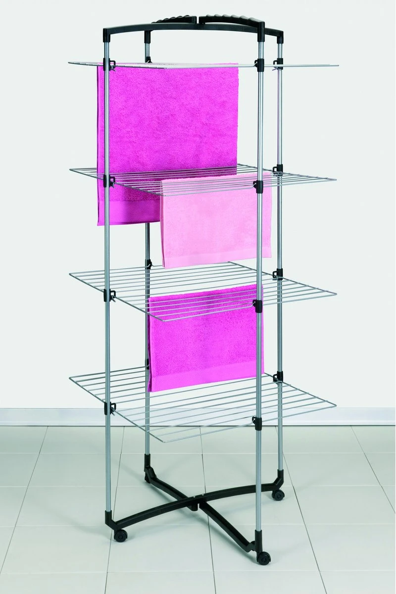 De Metaltex Faro droogtoren met 38 meter drooglengte is ideaal voor kleine ruimten. Je kunt kiezen of je alle rekken gebruikt of alleen een paar. In dat geval kun je de droogtoren half openen en deze tegen de muur plaatsen. Maar je kunt hem ook geheel openen en er bijvoorbeeld een lange badhanddoek aan laten drogen. Dankzij de 4 wielen is de toren makkelijk te verplaatsen. De Faro droogtoren behoort tot de Tec collectie, die zich kenmerkt door zilvergrijs geplastificeerd staaldraad met een sterke zachte coating in combinatie met satijn zwarte kunststof onderdelen.