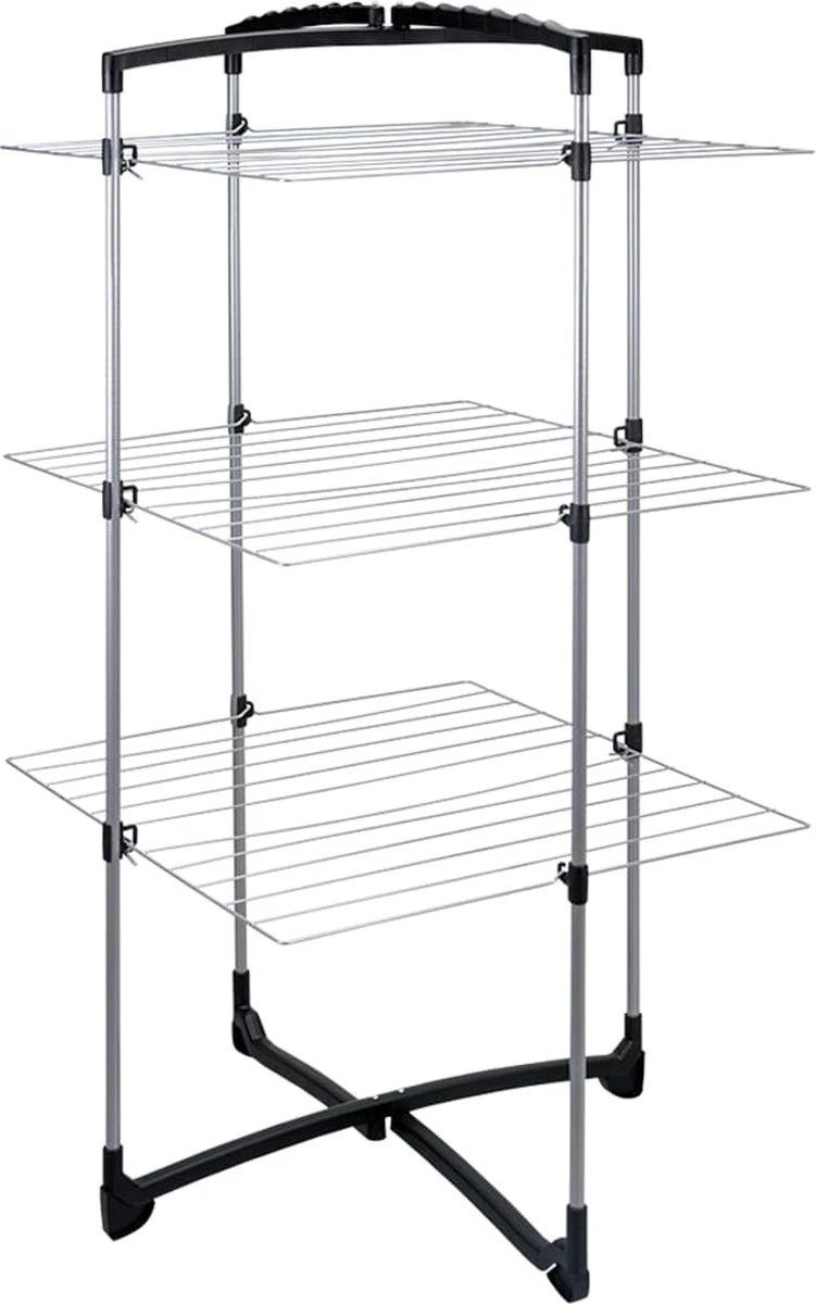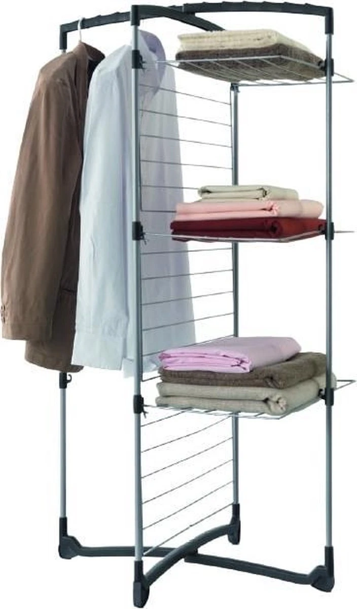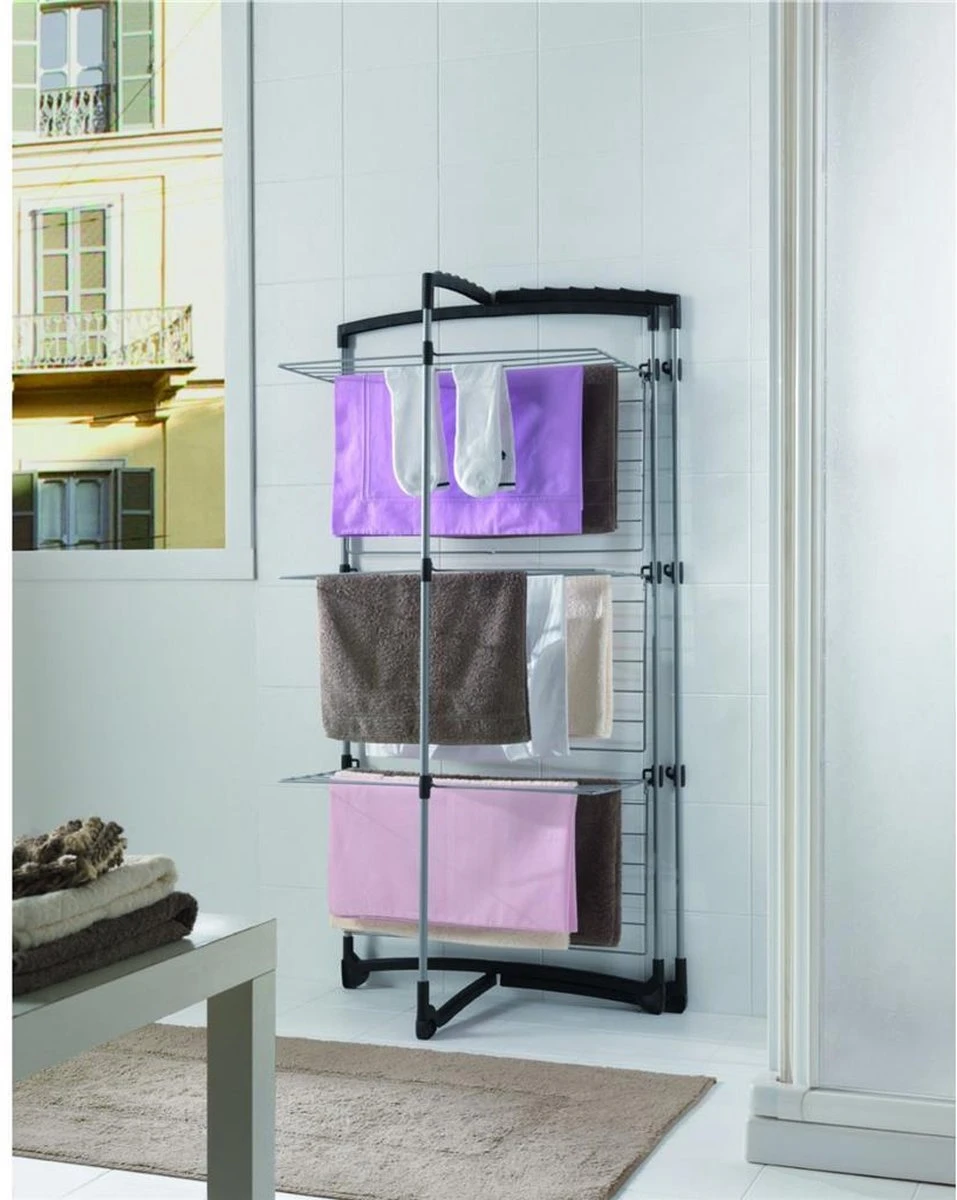 De Fortino 3 droogtoren met 25 meter drooglengte is ideaal voor kleine ruimten. Je kunt kiezen of je alle rekken gebruikt of alleen een paar. In dat geval kun je de droogtoren half openen en deze tegen een muur plaatsen. Maar je kunt hem ook geheel openen en er bijvoorbeeld een lange badhanddoek op laten drogen. Dankzij de anti-slipvoeten is de Fortino 3 heel stabiel. Je 2 bovenste armen kunnen gebruikt worden om klerenhangers te hangen. De droogtoren behoort tot de Tec collectie, welke zich kenmerkt door zilvergrijs geplastificeerd staaldraad met een sterke zachte coating in combinatie met satijnzwarte kunststof onderdelen. De afmetingen van de Metaltex Fortino 3 zijn: in gebruik 69x64x134 cm. Na gebruik buiten, binnen opbergen.
