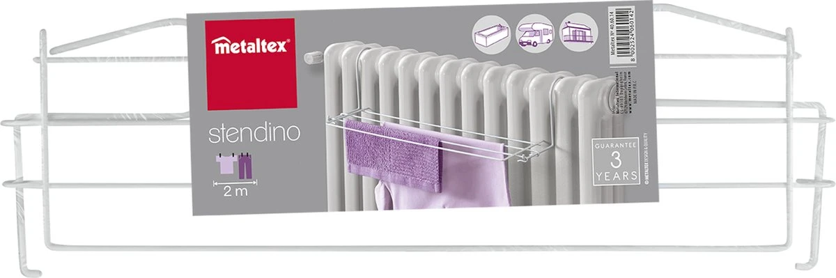 Metaltex Stendino droogrek biedt ruimte voor twee meter wasgoed. Het rek kan gemakkelijk opgehangen worden zodat je de was aan de radiator, het balkon of in het raamkozijn kunt drogen.