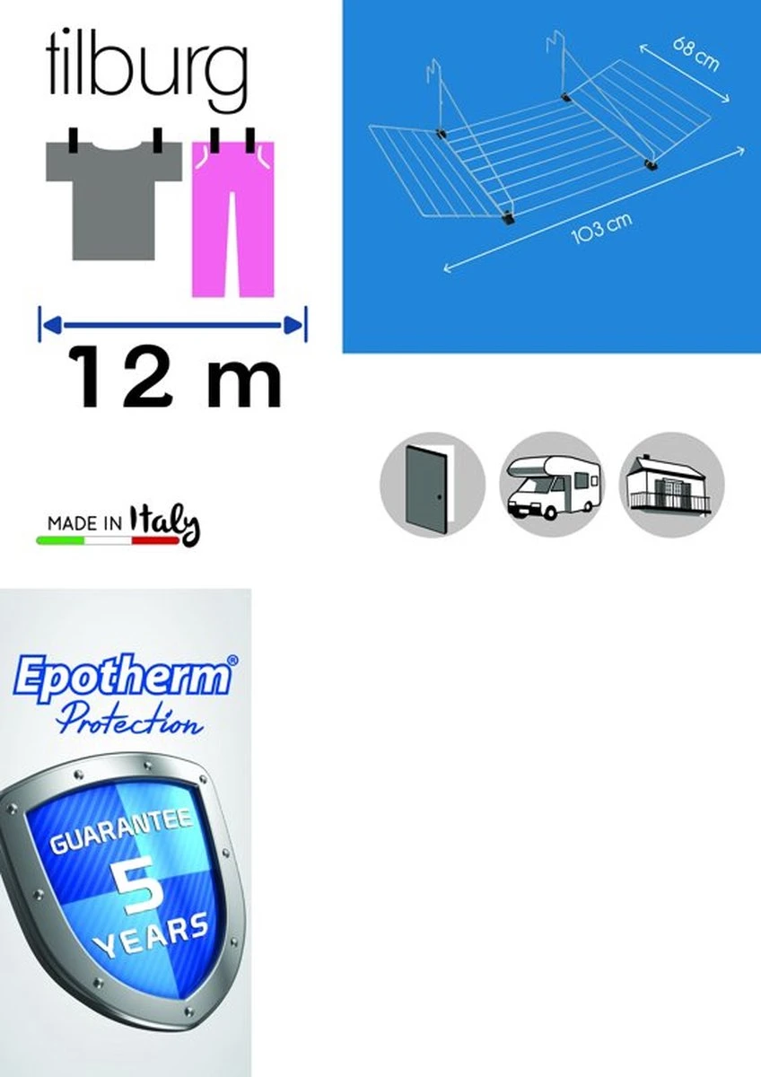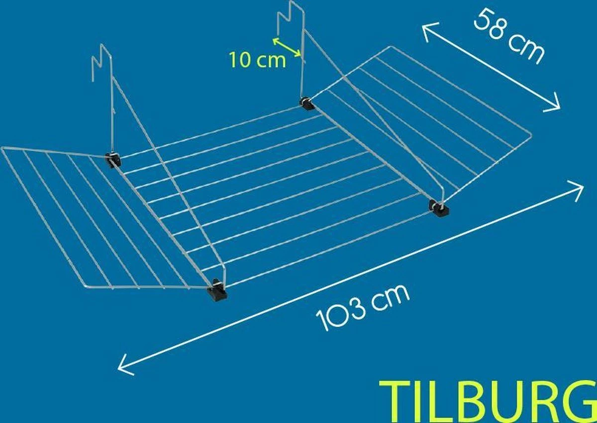 Het Tomado Tilburg droogrek is compact, met inklapbare armen en vleugels. Dichtgeklapt zijn de afmetingen slechts: 68x55x3cm. Als je het Tilburg hangdroogrek opent, neemt het een ruimte in van 58×103 cm. Het rek heeft een harde Epotherm coating die het droogrek roest- en UV-bestendig, maar ook anti-statisch maakt. Na gebruik buiten, binnen opbergen.