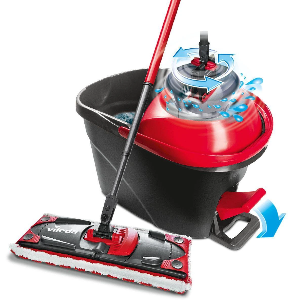 Ultramat Turbo van Vileda is een vlakke vloersysteem geleverd met een emmer met roterende pers.