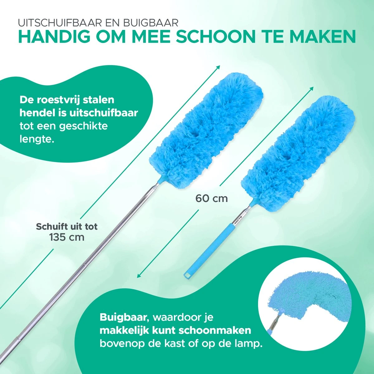 Waarom moeilijk doen als het ook makkelijk kan? Met de uitschuifbare plumeau staat u nooit meer te zwoegen om die onbereikbare hoge plekken af te stoffen. De plumeau heeft een normal lengte van 60. Wanneer u deze uitschuift, is de lengte 135 cm, zodat u gemakkelijk plafonds of de bovenkant van kasten kan bereiken.